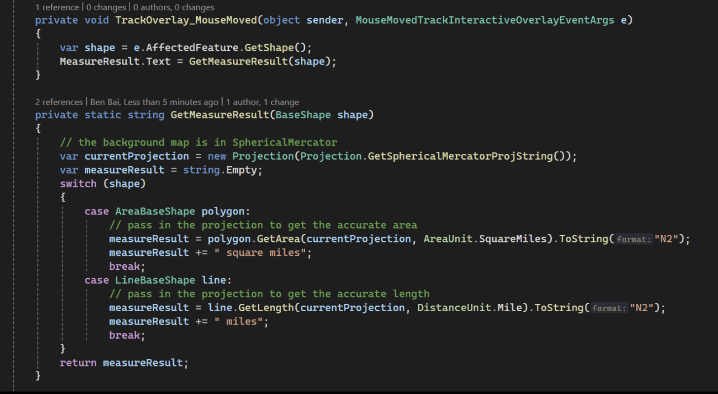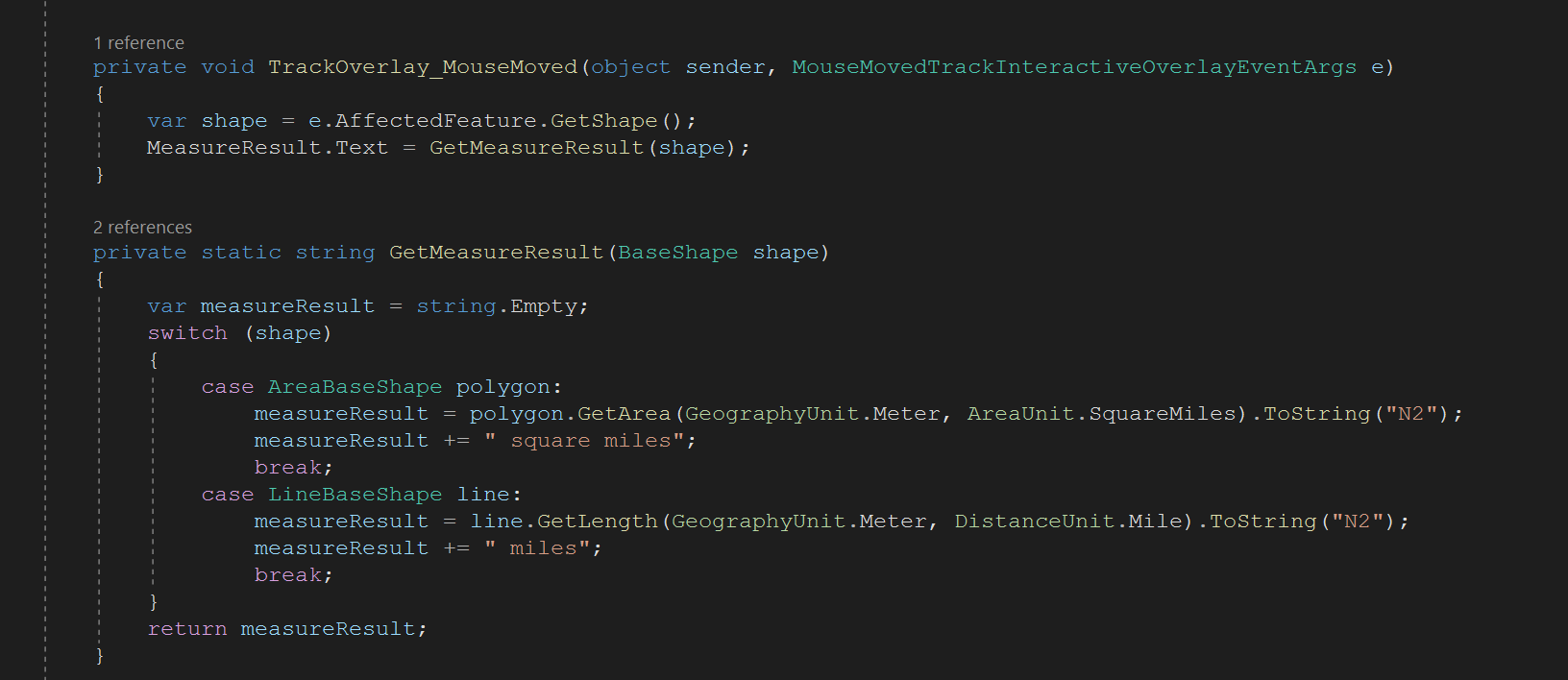 The main functionality of this sample is implemented in the MouseMoved event on the TrackInteractiveOverlay. This event fires anytime the mouse moves while the user is drawing a shape. You can see in the code below that the shape being drawn is in the AffectedFeature property of the event args. Once you have the feature being drawn, it’s a simple matter of using the GetArea method in the AreaBaseShape or the GetLength method in the LineBaseShape to calculate and then display the result in the sidebar.