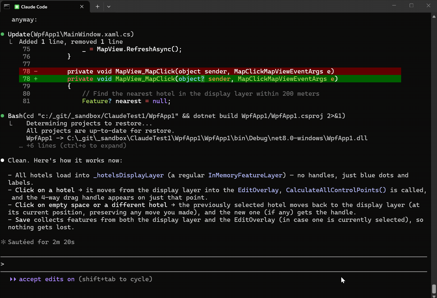 Claude Code with the help of the new ThinkGeo MCP Server directly adding new functionality to a WPF map.